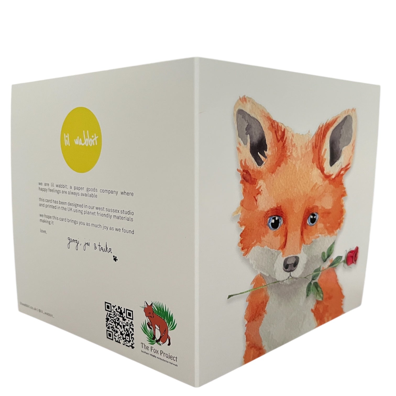 Celebrate every occasion with our charming 'Love You!' card designed exclusively for The Fox Project by 'lil wabbit,' a talented artist based in West Sussex. Crafted using planet-friendly materials, this card features an adorable watercolor illustration of a fox with a rose, perfect for conveying warmth, joy and love.